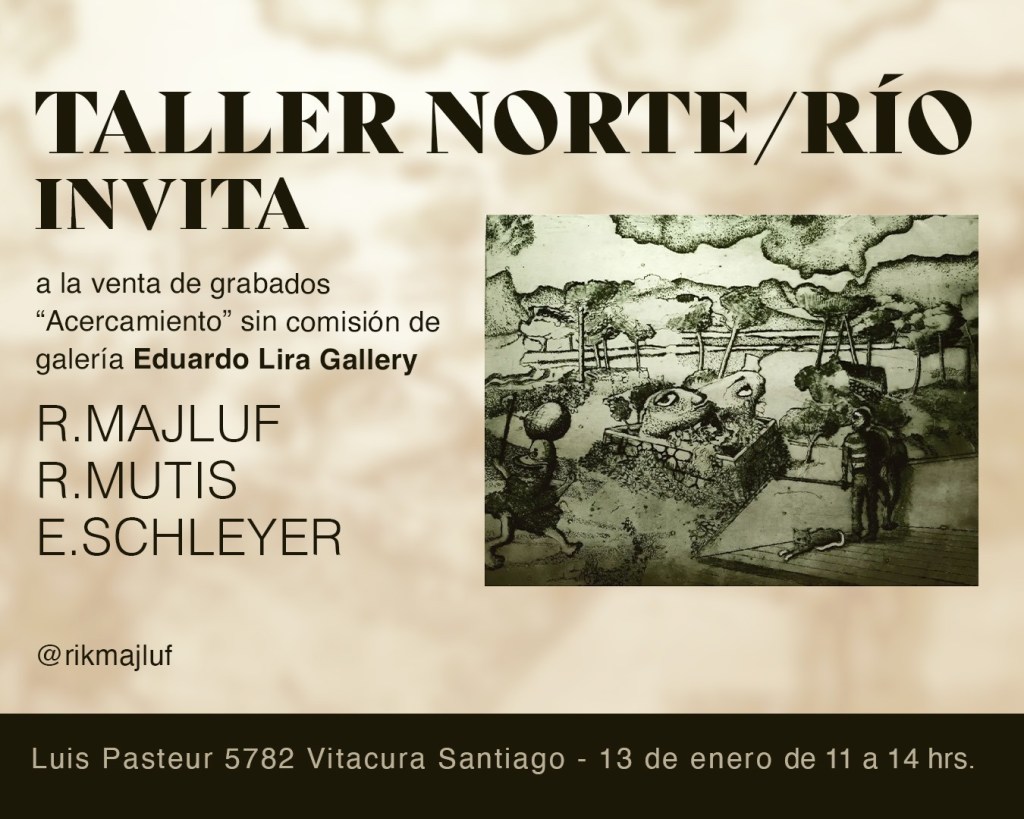 Una interesante venta de arte reciclado, bajo el título de “Acercamiento”, se realizará este viernes 12 y sábado 13 de enero, en la destacada Galería Eduardo Lira. El proyecto es parte del colectivo Norte/Río, conformado por los artistas, Ricardo Majluf, Ronald Mutis y Erich Schleyer, quienes invitan a todos a visitarla.