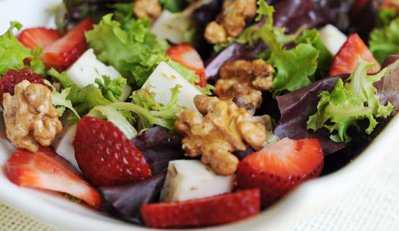 - En una fuente, poner la lechuga, las frutillas y el queso de cabra. Añadir las nueces especiadas y el aliño de amapolas. Mezclar todos los ingredientes y servir inmediatamente.