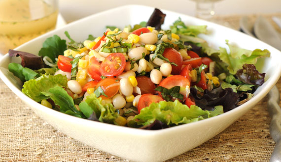 - Para la ensalada, juntar todos los ingredientes, agregar el aliño y revolver. Poner la ensalada sobre una cama de lechugas y servir.
