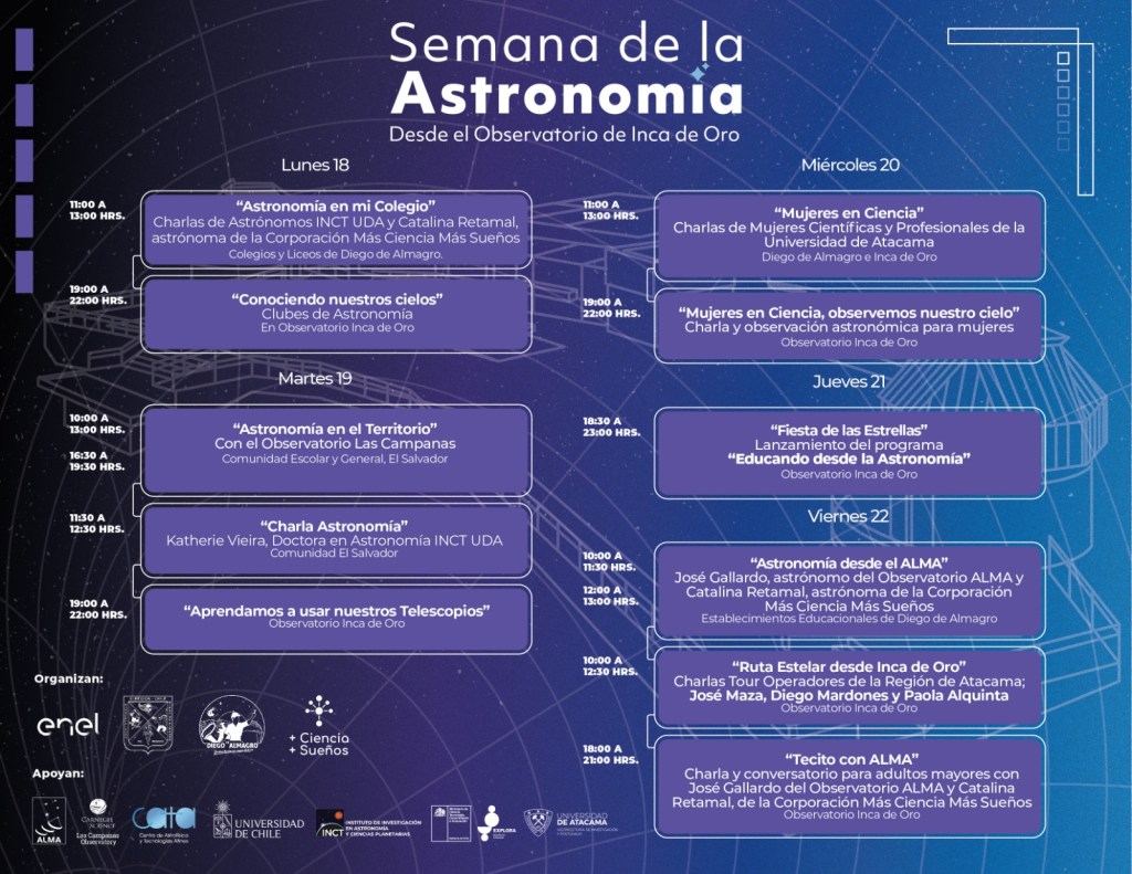Entre el 18 y 22 de marzo, la Semana de la Astronomía tendrá como puntos de encuentro el Observatorio Inca de Oro y establecimientos escolares de Diego de Almagro, Inca de Oro y El Salvador. Con la presencia de diversos científicos de la región y el país, se brindarán charlas sobre astroturismo, uso de telescopios, mujeres en la ciencia, además de observaciones para niños/as, adolescentes, adultos/as jóvenes y mayores, entre otras actividades.