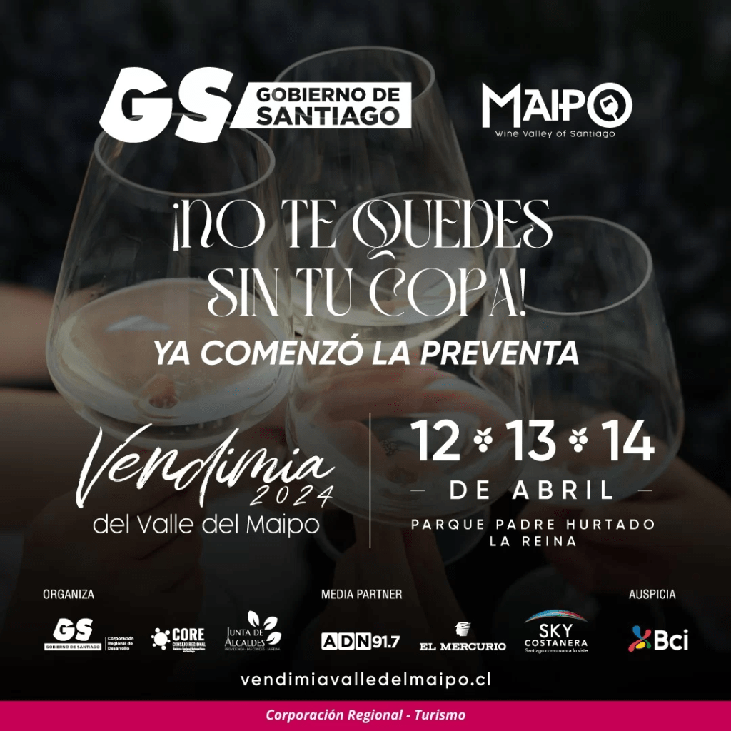 Esta nueva versión de la “Fiesta de la Vendimia Valle del Maipo 2024” se realizará los días viernes 12, sábado 13 y domingo 14 de abril en el Parque Alberto Hurtado, ex Intercomunal de La Reina, y quienes la visiten podrán conocer diversos y novedosos productos de los 150 emprendedores y expositores de las 52 comunas de la Región Metropolitana que estarán presentes este año, porque la idea también es ayudar a la reactivación económica a través del Turismo.