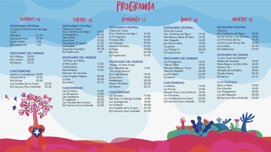 Este año, en la fonda oficial se presentarán artistas, como Pettinellis, Sol y Lluvia, Garras de Amor, Sonora Tommy Rey y Sonora Barón. Habrá dos escenarios, un cuecódromo, más de treinta cocinerías, más de noventa stands y más de quince food trucks, entre otras atracciones. Más información en www.eventrid.cl/fondasantiago2023.