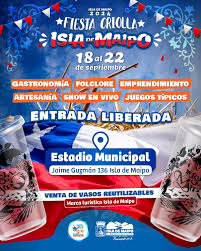En la Fiesta Criolla de Isla de Maipo, habrá artistas locales, patio de comidas, food trucks, artesanía, productores, un patio para niños y un rincón campesino. Se presentarán artistas, como la Sonora Dinamita, Sonora Jr. L. Palacios, Luis Lambis y Elemental Pipo y sus geniales. La entrada es liberada. Más información en www.islademaipo.cl.