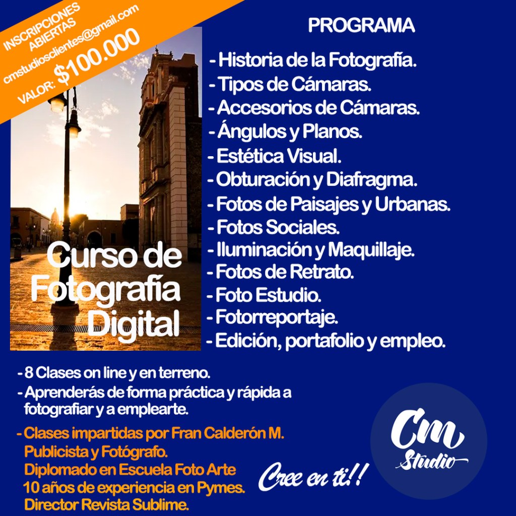 Curso de fotografía digital para amateurs que desean aprender fotografía desde el principio. Puedes traer tu cámara si la tienes. Es presencial o clases on line. Tú eliges. Clases teóricas y prácticas, en terreno y en estudio de fotografia.