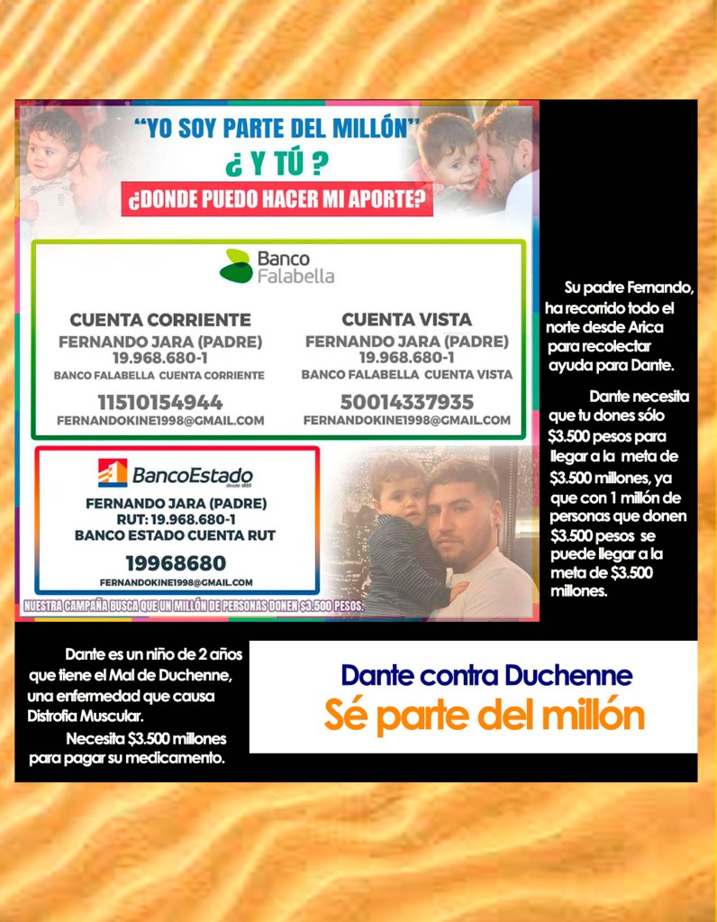 Dante es un niño de 2 años, oriundo de Arica en Chile, cuyo padre, con recursos económicos limitados para la gran cantidad de dinero que debe pagar por Elevidys, su tratamiento, ha caminado desde esa ciudad, hasta Santiago, pueblo por pueblo, lugar por lugar, intentando recaudar fondos para comprar su medicamento que tiene el costo de $3.500 millones y debe realizar un tratamiento en Estados Unidos. Te dejamos el afiche para que lo imprimas, repartas y hables con gente que pueda hacer donaciones, que ayude en este caso.