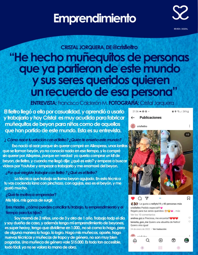 CRISTAL JORQUERA, EMPRENDEDORA: «HE HECHO MUÑEQUITOS DE PERSONAS QUE YA PARTIERON DE ESTE MUNDO Y SUS SERES QUERIDOS QUIEREN UN RECUERDO DE ESA PERSONA». diciembre 29, 2024 francalderonpublicidadaudiovisual ENTREVISTA: Francisco Calderón M. – FOTOGRAFIA: Cristal Jorquera Comparte esto: Haz clic para compartir en X (Se abre en una ventana nueva) X Haz clic para compartir en Facebook (Se abre en una ventana nueva) Facebook Me gusta Cargando... Relacionado Publicado por francalderonpublicidadaudiovisual Ver todas las entradas de francalderonpublicidadaudiovisual
