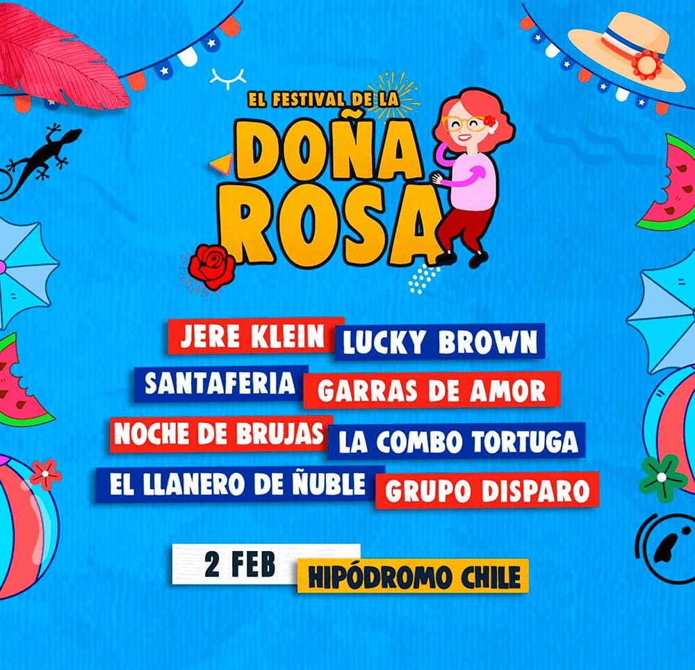 - 2 de febrero: Festival Doña Rosa con Jere Klein, Lucky Brown, Santaferia, Garras de Amor, Noche de Brujas y más en el Hipódromo Chile.