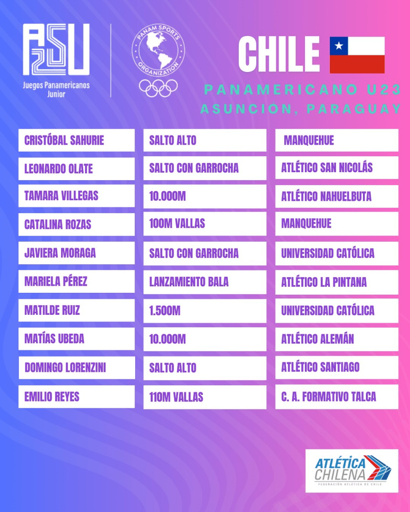 Carrizo competirá en las exigentes pruebas de 5.000 y 10.000 metros planos, consolidando así su proyección como uno de los mejores fondistas jóvenes del país. En total, serán 20 atletas nacionales —6 mujeres y 14 hombres— quienes defenderán los colores de Chile en esta cita continental, junto a un equipo técnico conformado por 5 entrenadores.